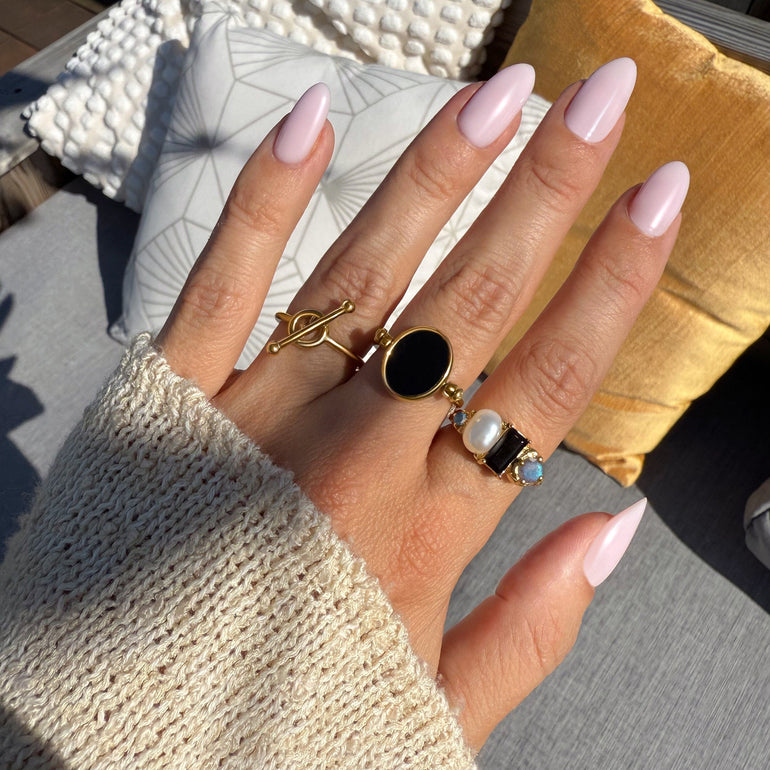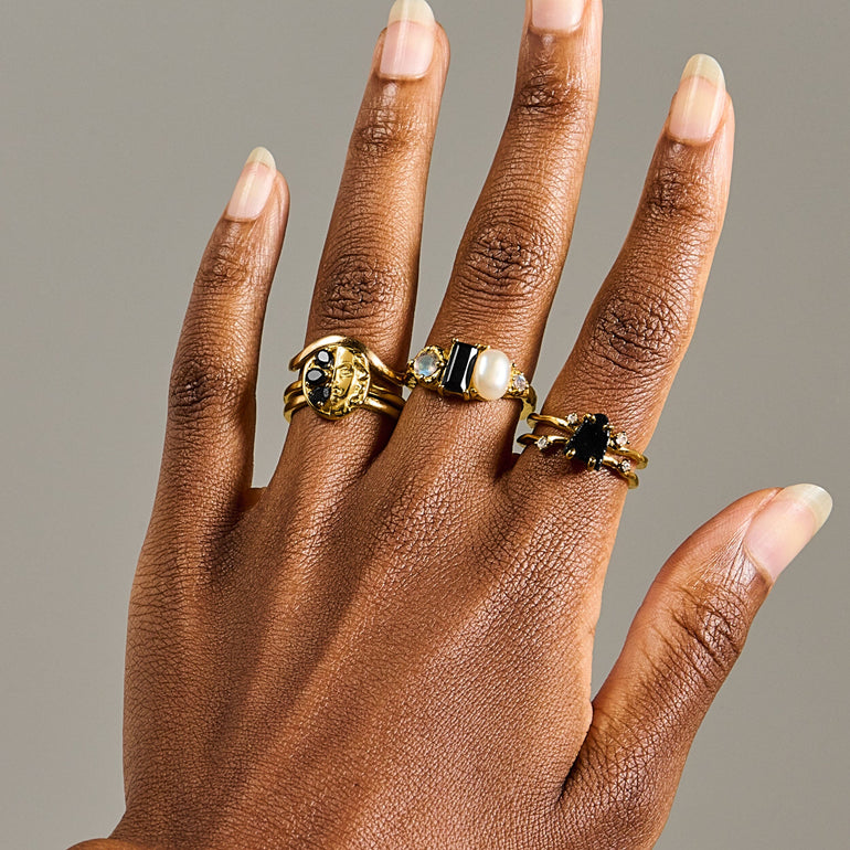 Pearl’s soft color. Obsidian’s deep grounding. Labradorite’s hidden spark. Three forces of nature sealed in metal, carrying the quiet magic of something unearthed.