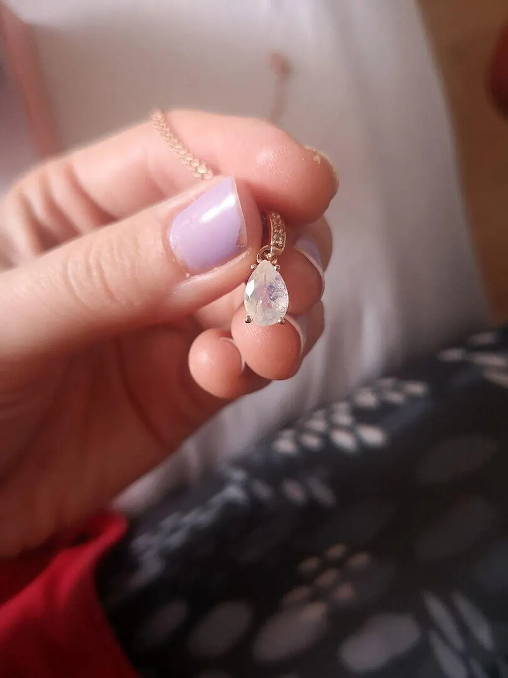 The moonstone is beautiful as well as the necklace. The bluish reflection is there and really looks magical. The only downside is that there seem to be cracks inside the gem, but research into it showed the cracks to be due to extreme changes of temperature (probably happened throughout the delivery process), however the moonstone shines and remains beautiful all the same.