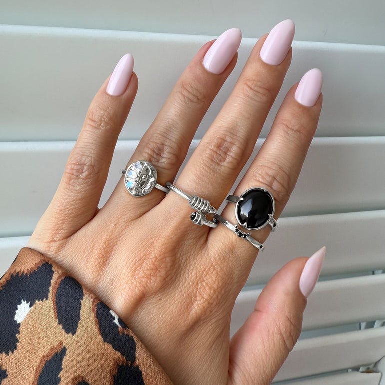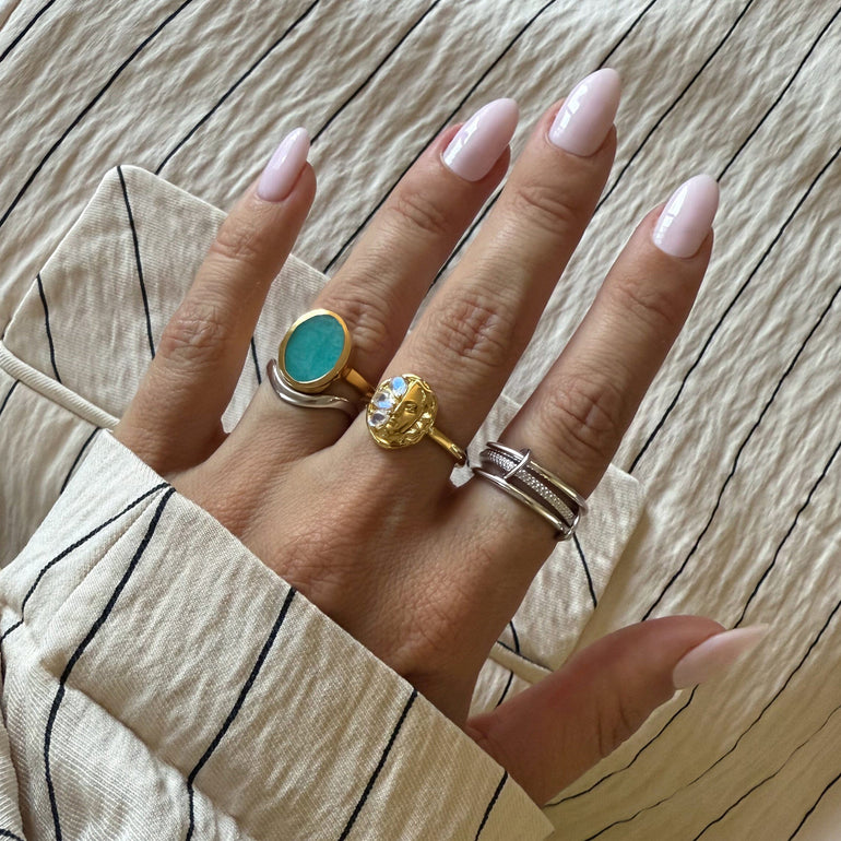 Let this ring remind you of who you already are. The Goddess Ring is a dual-sided talisman, designed to honor both your presence and your potential. One side is a sculpted form that mirrors your role as a modern goddess. The other side channels the luminous energy of moonstone to support your intuition and sense of inner alignment. This piece is a reminder that the way you show up in the world is already powerful, and the energy you carry within is your quiet anchor.