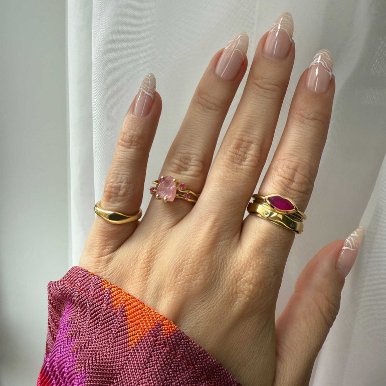 Gentle Rose Quartz meets fiery Ruby for a perfect balance of self-love and drive. This ring is more than sparkle, it’s your mini power-up for every day.