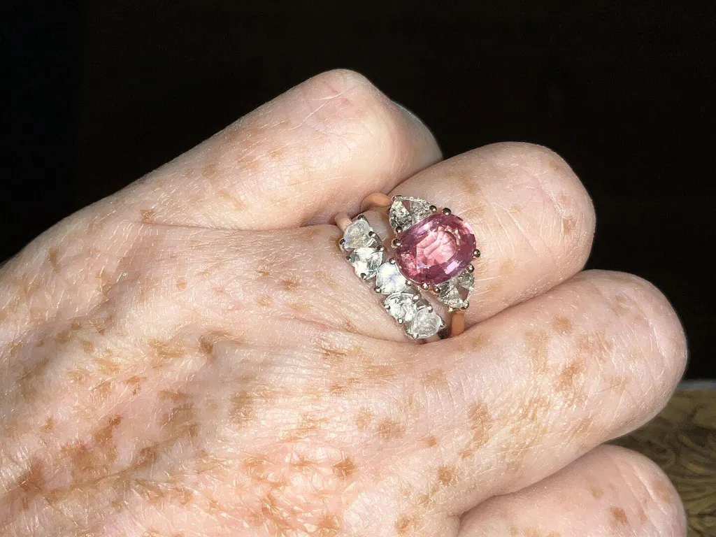 My wedding ring is a 3-stone ring with an oval center padparadscha sapphire, flanked by 2 heart-shaped diamonds. I knew this band with alternating heart stones would be a lovely match to wear with it. I am very pleased with my ring and tempted to get it in rose plated as well. Solid rose gold would be perfect, but I love what I’ve got.